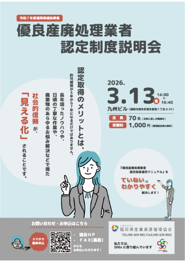 福岡県産業資源循環協会では、産業廃棄物処理に携わる上で必要な知識・情報の習得を目的とした研修会・セミナーを実施しています。