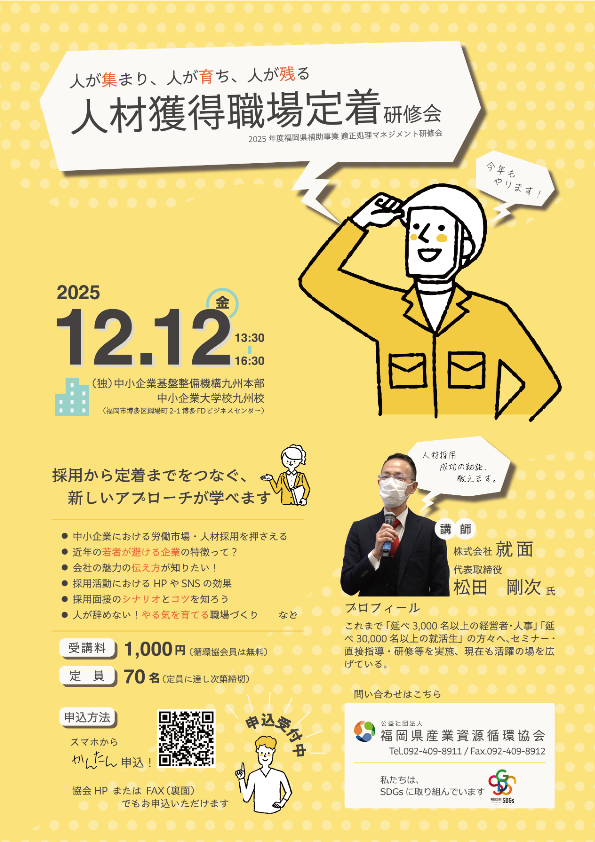 本研修会では、効果的な人材の採用方法から、働き続けたいと思える職場づくりまで、実践的なポイントをお伝えします。