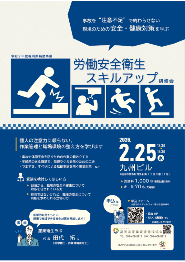 本研修会では、個人の注意力だけに頼らず、事故や体調不良を防ぐために職場や作業をどう整えるかという視点で、現場で実践できる安全対策を解説します!