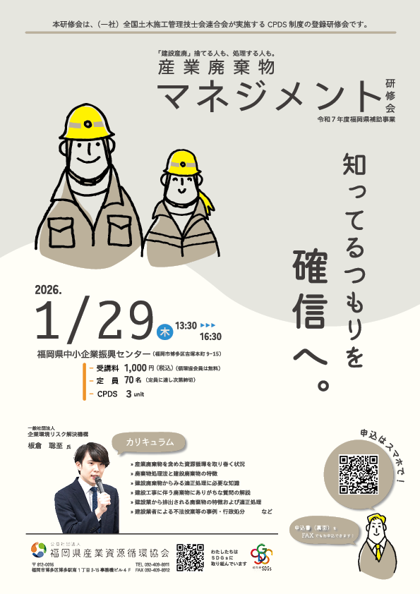 福岡県産業資源循環協会では、産業廃棄物処理に携わる上で必要な知識・情報の習得を目的とした研修会・セミナーを実施していますので、ご参加いただき、適正処理・循環型社会形成の推進に努めましょう。